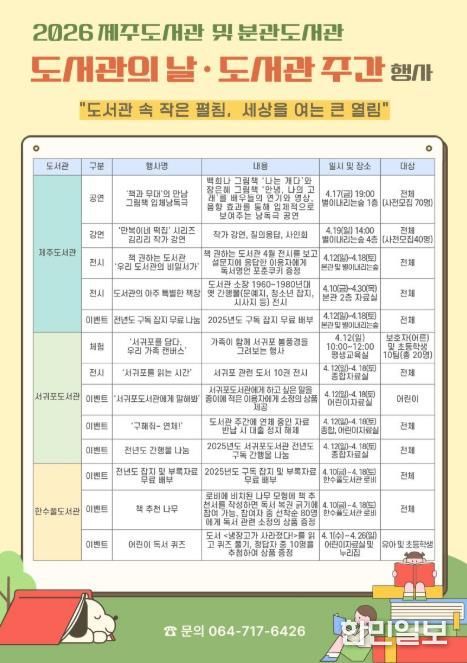 한민일보 서울포커스 임경복 기자 | 제주도교육청 제주도서관은 4월 12일부터 18일까지 제주도서관 본관 및 도내 지역도서관 등 5개 분관에서 2026년 도서관의 날 및 도서관 주간을 맞아 다양한 독서문화 행사를 운영한다.