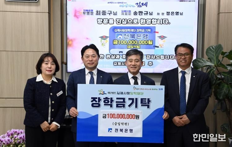 한민일보 서울포커스 박용남 기자 | 김제사랑장학재단은 27일 전북은행이 지역 인재들이 안정적으로 학업과 미래를 준비할 수 있도록 장학금 1억원을 기탁했다고 밝혔다.