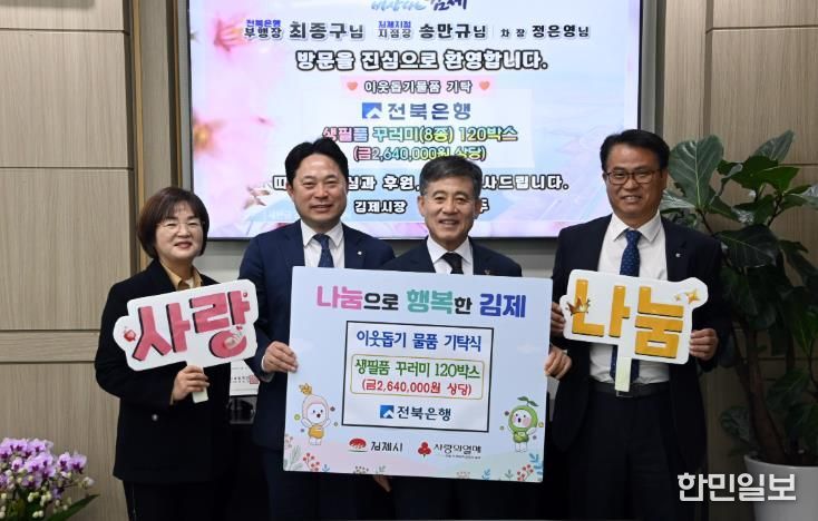 한민일보 서울포커스 박용남 기자 | 김제시는 27일 전북은행이 관내 저소득 계층을 위한 264만 원 상당의 생필품 꾸러미 120박스를 기탁하며 변함없는 지역 사랑을 실천했다고 밝혔다.