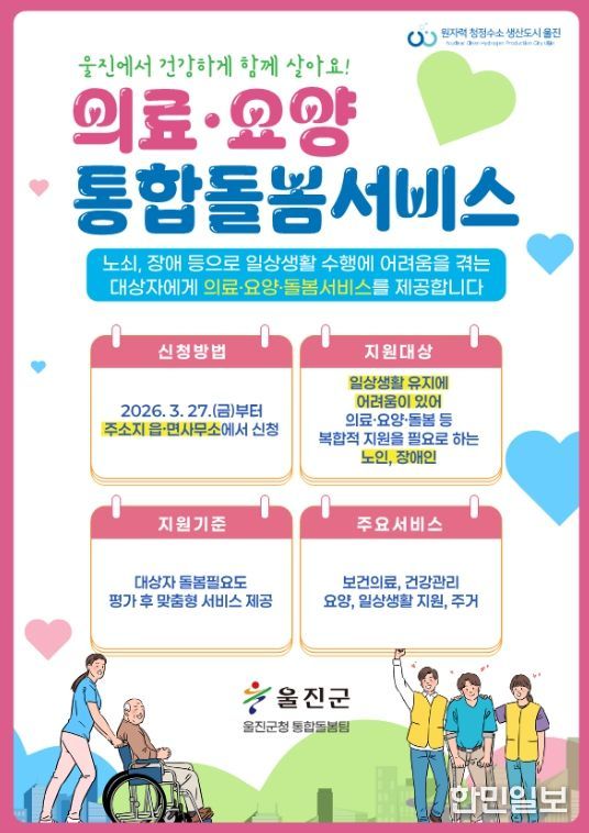 한민일보 서울포커스 김서윤 기자 | 울진군은 3월 27일부터 의료, 요양, 돌봄 등 복합적인 지원이 필요한 노인, 장애인을 대상으로 의료요양 통합돌봄사업을 본격 시행한다.
