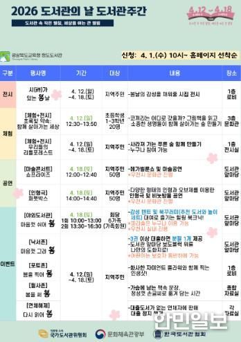 한민일보 서울포커스 임경복 기자 | 경상북도교육청 청도도서관은 2026년 도서관의 날(4. 12.)과 도서관주간(4. 12.~18.)을 맞아 ‘도서관 속 작은 펼침, 세상을 여는 큰 열림’이라는 주제로 다채로운 문화 행사를 운영한다.