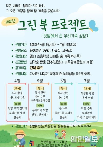 한민일보 서울포커스 박용남 기자 | 남원학생교육문화관 운봉분관은 가족 단위 이용자들의 도서관 참여를 확대하고 가정 내 지속적인 독서 습관 형성을 돕기 위해 텃밭 체험과 독서 활동을 결합한 ‘그린북 프로젝트’를 운영한다.