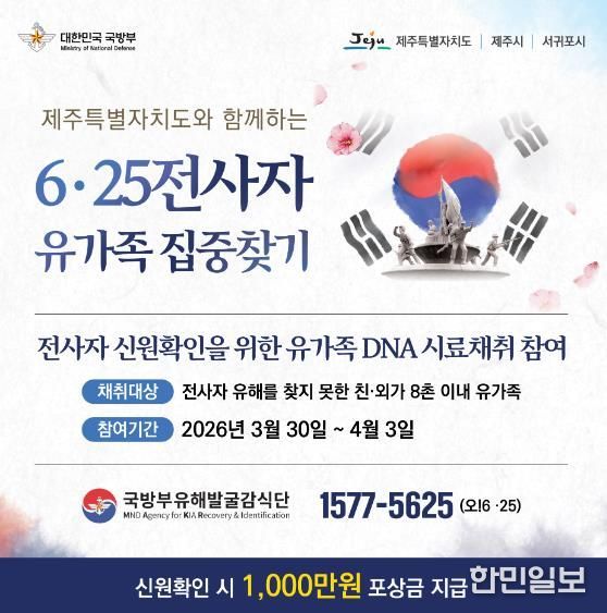 한민일보 서울포커스 임경복 기자 | 국방부 유해발굴감식단은 3월 30일부터 4월 3일까지 5일간 제주특별자치도 전역에서 6·25 전사자의 유가족을 찾기 위한 ‘유가족 집중 찾기’ 활동을 전개한다.