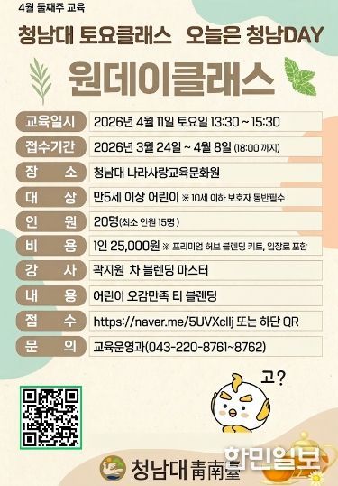 강혜경 청남대 소장은 “따뜻한 봄날, 청남대를 찾은 방문객들이 향긋한 차와 함께 일상의 스트레스를 비워내는 시간을 갖길 바란다”며 “앞으로도 청남대의 자연과 어우러지는 다채로운 프로그램을 지속적으로 선보이겠다”고 말했다.