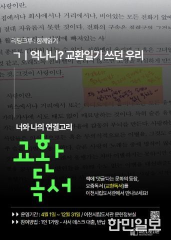 한민일보 서울포커스 박용남 기자 | 이천시립도서관은 시민들이 서로 소통하며 즐겁게 책을 접할 수 있도록, 오는 4월 1일부터 12월 31일까지 시립도서관 문헌정보실에서 ‘리딩크루’ 사업의 일환인 ‘교환독서’ 프로그램을 운영한다.