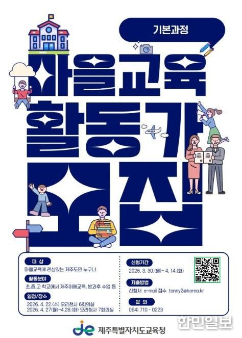 한민일보 서울포커스 임경복 기자 | 제주특별자치도교육청은 31일 학교와 마을이 협력하여 아이들의 배움과 성장을 지원하는 ‘2026년 마을교육활동가 기본과정’ 참여자를 제주특별자치도교육청이 공개 모집한다고 밝혔다.