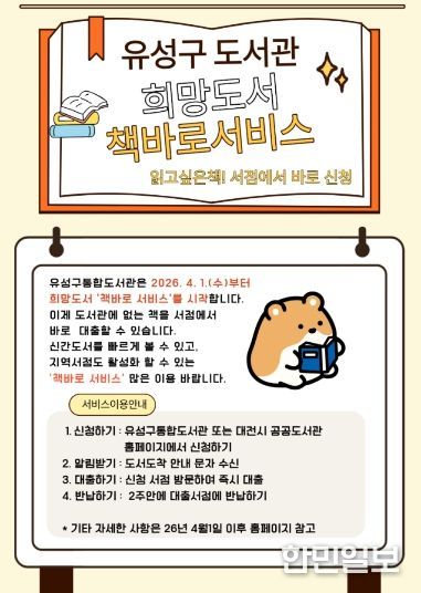 정용래 유성구청장은 “이번 서비스를 통해 책을 기다리는 시간을 줄이고 독서 접근성이 향상되길 바란다”라며 “앞으로도 지역 서점과 상생하는 독서 정책을 확대하겠다”라고 말했다.