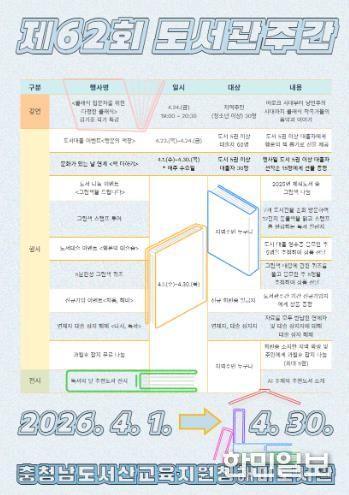 한민일보 서울포커스 임경복 기자 | 충청남도서산교육지원청해미도서관은 제4회 도서관의 날(2026. 4. 12.)과 제62회 도서관 주간(2026. 4. 12.~4. 18.)을 맞아 ‘도서관 속 작은 펼침, 세상을 여는 큰 열림’을 슬로건으로 지역주민과 학생들이 함께할 수 있는 다양한 독서문화행사를 운영한다.