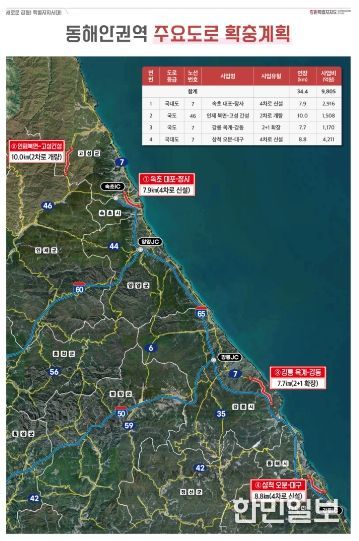삼척 오분~대구(8.8km), 속초 대포~장사(7.9km), 강릉 옥계~강동(7.7km) 구간에는 노선우회 4차로를 신설하고, 일부구간은 3차로로 확장하는 한편, 진부령 위험구간 개량사업도 병행해 6차 국도·국지도 건설계획에 반영한다는 방침이다.