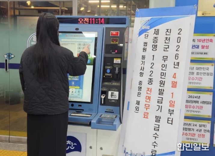 한민일보 서울포커스 김다남 기자 | 충북 진천군이 4월 1일부터 무인민원발급기를 통해 발급하는 각종 민원서류 수수료를 전면 면제 제도를 시행했다.