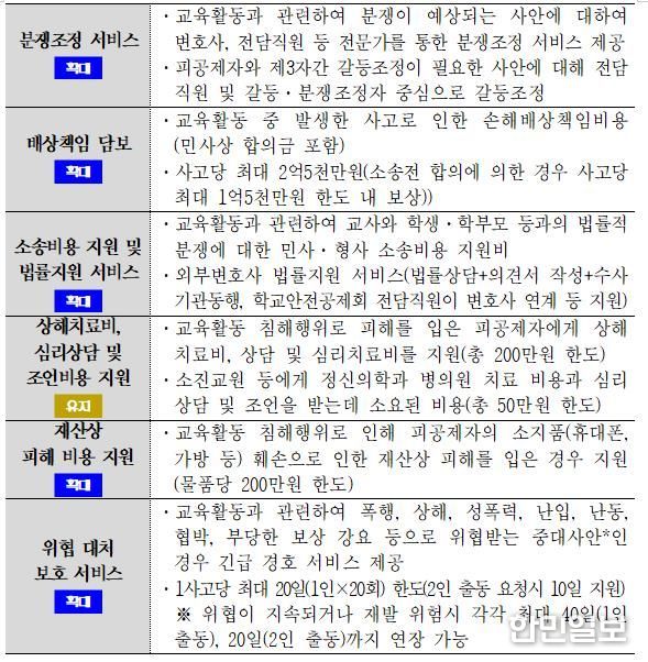 교육활동 침해로 인한 재산상 피해 지원 금액은 물품당 100만 원에서 200만 원까지 확대하고, 손해배상책임 보장 한도는 사고당 최대 2억 5,000만 원으로 상향한다.
