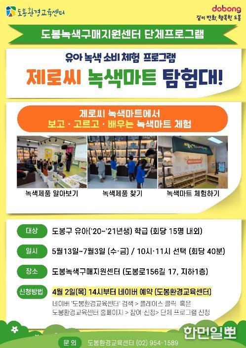 한민일보 서울포커스 김봉순 기자 | 서울 도봉구 도봉녹색구매지원센터가 ‘2026년 상반기 유아 대상 녹색소비 체험 프로그램’을 운영한다.