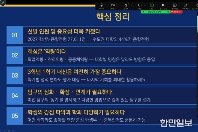 컨설팅은 고등학교 3학년을 대상으로, 좋은일코칭연구소 김병식 대표와 함께 진행했다. 이날 학생들에게 2027학년도 대입 학생부 종합 전형의 특성과 대학 평가 시스템 등을 이해하기 쉽게 설명했다.