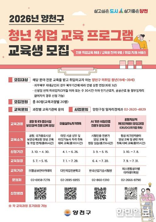 한민일보 서울포커스 곽동근 기자 | 양천구가 지역 청년들의 구직 경쟁력을 강화하고 실질적인 취업 성공을 지원하기 위해 ‘2026년 청년 취업 교육 프로그램’을 본격적으로 운영하고, 교육생 80명을 모집한다고 밝혔다.