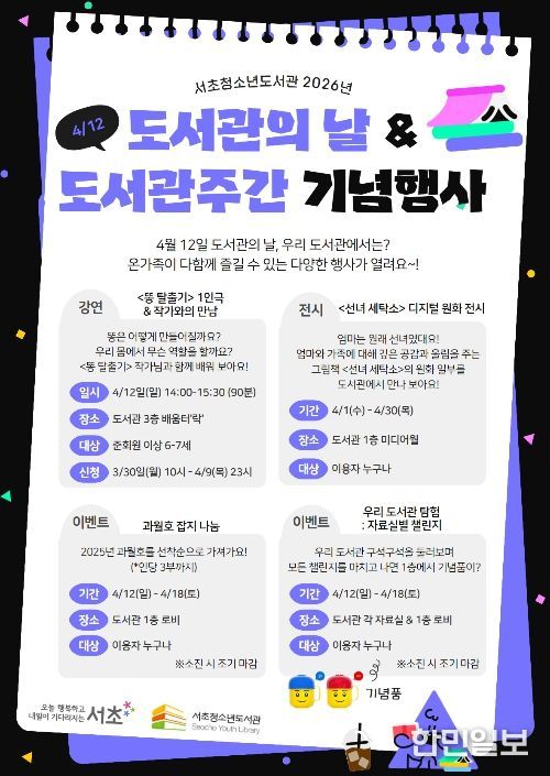 아울러 서초청소년도서관은 어린이·청소년 특화 프로그램을 선보인다. 12일 '똥 탈출기' 1인극에 이어 작가와의 만남을 통해 어린이들의 상상력을 자극하고, 한 달간 미디어월을 통한 디지털 원화 전시 '선녀 세탁소'와 자료실별 미션 챌린지를 진행한다.