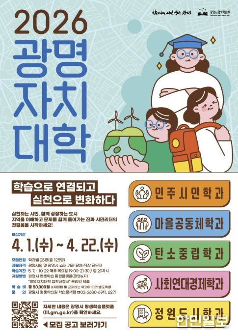 한민일보 서울포커스 임광현 기자 | 광명시가 시의 핵심의제인 평생학습 마을리더 양성과정 ‘광명자치대학’ 2026년 신입생 125명을 오는 22일까지 모집한다.