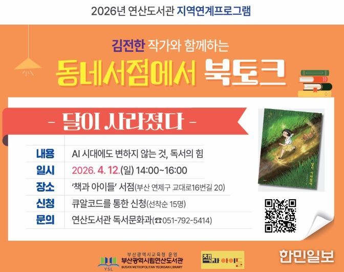한민일보 서울포커스 임광현 기자 | 부산광역시립연산도서관은 오는 12일 오후 2시부터 독립서점 ‘책과 아이들’에서 지역 주민 15명을 대상으로 ‘동네서점에서 북토크’ 행사를 개최한다.