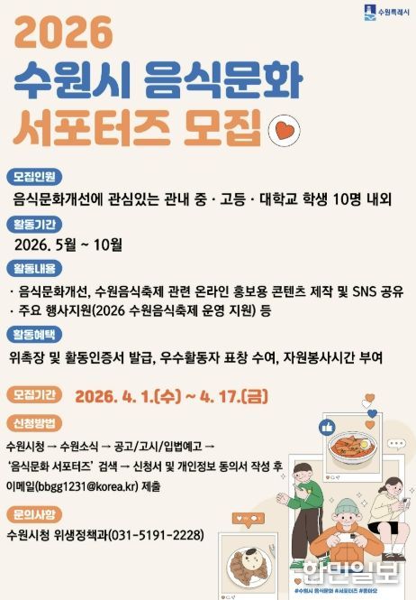 한민일보 서울포커스 진광성 기자 | 수원특례시는 ‘2026년 음식문화 서포터즈’로 활동할 중·고등·대학생을 4월 17일까지 모집한다.