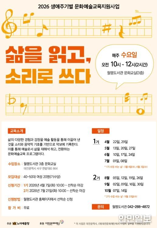 ‘삶을 읽고, 소리로 쓰다’는 이달 7일 오전 10시부터, ‘선율과 문장’은 21일 오전 10시부터 월평도서관 홈페이지에서 선착순으로 모집한다.
