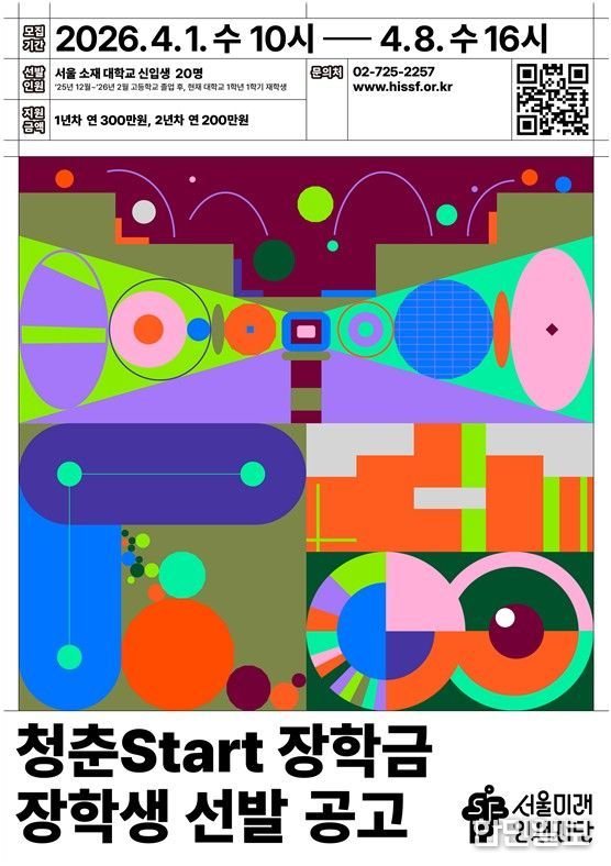 한민일보 서울포커스 국용호 기자 | 서울미래인재재단이 ㈜두산 임직원 기부금으로 14년째 운영 중인 '청춘Start장학금' 14기 장학생 20명을 모집한다. 서울 소재 대학에 올해 입학한 저소득 신입생을 대상으로 2년간 총 500만 원의 학업장려금을 지급하며, 신청은 4월 8일 16시까지 재단 누리집에서 받는다.