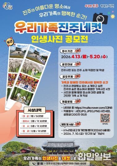 한민일보 서울포커스 김은금 기자 | 진주시는 가족과 함께한 일상 속 행복한 순간을 공유하고 가족 친화적 가치를 확산하며 지역에 대한 애향심을 높이기 위해 2026년 인구정책 '우리 가족 진주 네 컷' 인생사진 공모전을 개최한다.