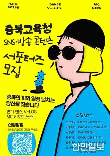 한민일보 서울포커스 임경복 기자 | 충청북도교육청은 6일부터 30일까지 교육청 홍보 콘텐츠 제작에 참여할 'SNS‧방송 콘텐츠 학생 서포터즈'를 모집한다고 밝혔다.