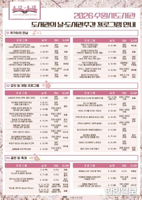 ‘아트 인사이드(창룡·광교홍재도서관, 4월 9~17일)’, ‘사계-봄 축제(호매실도서관, 4월 18일)’ 등 6개의 공연·축제가 열린다. ‘이진아 작가와의 만남(호매실도서관, 4월 15일)’, ‘예소연 작가와의 만남(선경도서관, 4월 16일)’ 등 12개의 저자 초청 강연도 열린다.