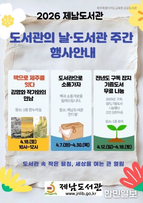 한민일보 서울포커스 임경복 기자 | 제주도교육청 제남도서관은 12일부터 도서관의 날과 도서관주간을 맞아 지역주민과 함께하는 다양한 독서문화 프로그램을 운영한다.