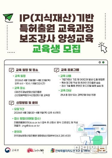 시와 전주정보문화산업진흥원(원장 허전, 이하 진흥원)은 지난해에 이어 올해도 전주 교육발전특구 사업의 일환으로 IP 기반, 미래사회 인재 육성을 위해 중장년 및 경력단절 여성 등을 대상으로 ‘IP(지식재산)기반 특허출원 교육과정’ 보조강사 양성교육을 시행한다고 6일 밝혔다.