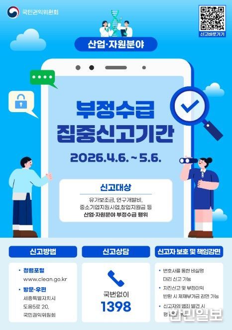 한민일보 서울포커스 임경복 기자 | 국민권익위원회는 6일부터 5월 6일까지 한 달간 유가보조금, 연구개발비, 창업지원금 등 산업·자원 분야 정부지원금 부정수급 집중신고기간을 운영한다고 밝혔다.