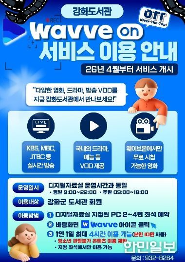 한민일보 서울포커스 김용택 기자 | 강화군은 오는 4월 7일부터 강화도서관 디지털자료실에서 OTT 영상 스트리밍 서비스인 ‘웨이브온(Wavve on)’을 이용할 수 있다고 밝혔다.