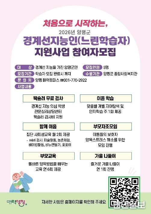 한민일보 서울포커스 차재만 기자 | 양평군은 2026년 처음으로 추진하는 ‘경계선지능인(느린학습자) 평생학습 지원 사업’에 참여할 학습자를 4월부터 본격 모집한다고 밝혔다.