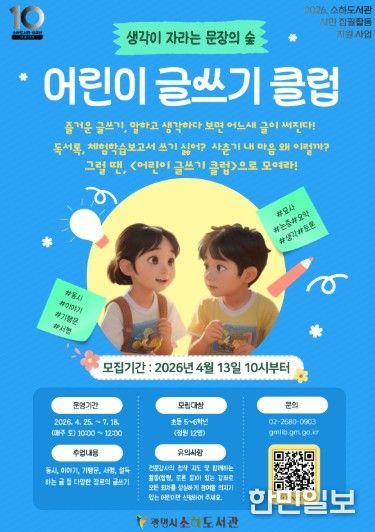 한민일보 서울포커스 임광현 기자 | 광명시 소하도서관은 어린이 글쓰기 클럽 ‘생각이 자라는 문장의 숲’ 수강생을 오는 13일부터 모집한다.