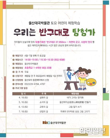 한민일보 서울포커스 임경복 기자 | 울산대곡박물관은 어린이 관람객을 대상으로 한 체험학습 ‘우리는 반구대로 탐험가’를 4월부터 7월까지 매월 셋째 주 토요일에 운영한다고 밝혔다.