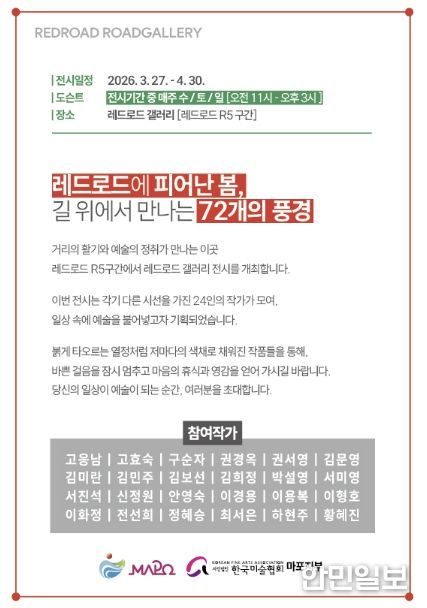 이번 전시는 ‘레드로드에 피어난 봄, 길 위에서 만나는 72개의 풍경’을 주제로 총 24명의 작가가 참여해 회화와 일러스트 등 다양한 작품 72점을 선보인다.