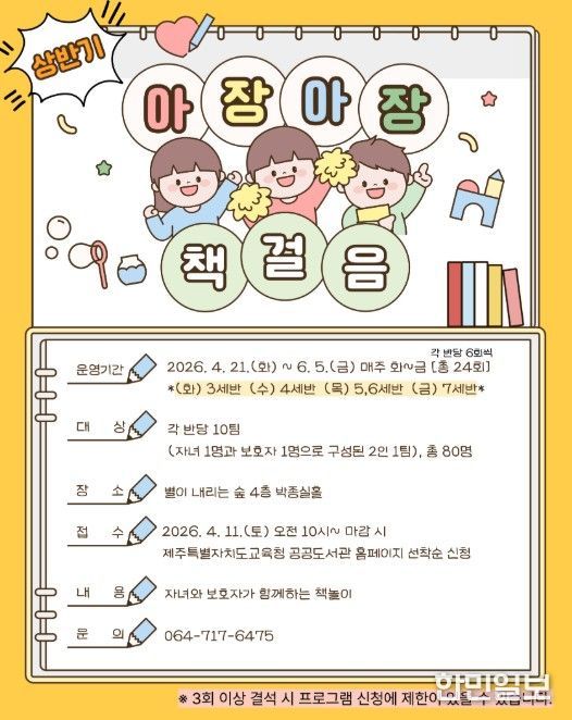 한민일보 서울포커스 임경복 기자 | 제주도교육청 제주도서관은 21일부터 6월 5일까지 영유아의 언어 발달과 올바른 독서 습관 형성을 지원하고 가정 중심의 독서 문화를 확산하기 위해 2026년 상반기 프로그램 ‘아장아장 책걸음’을 운영한다.
