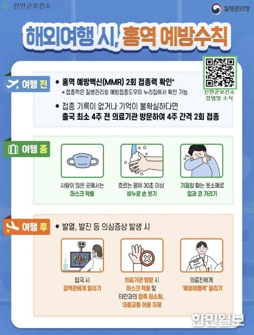 질병관리청에 따르면 2025년 국내 홍역 환자는 총 78명(해외유입 55명, 해외유입 관련 23명)이었으며, 2026년 4월 2일 기준 국내 홍역 환자는 5명으로 확인됐다. 이에 따라 해외여행을 계획 중인 군민과 영유아 보호자들의 예방수칙 준수가 더욱 중요해지고 있다.