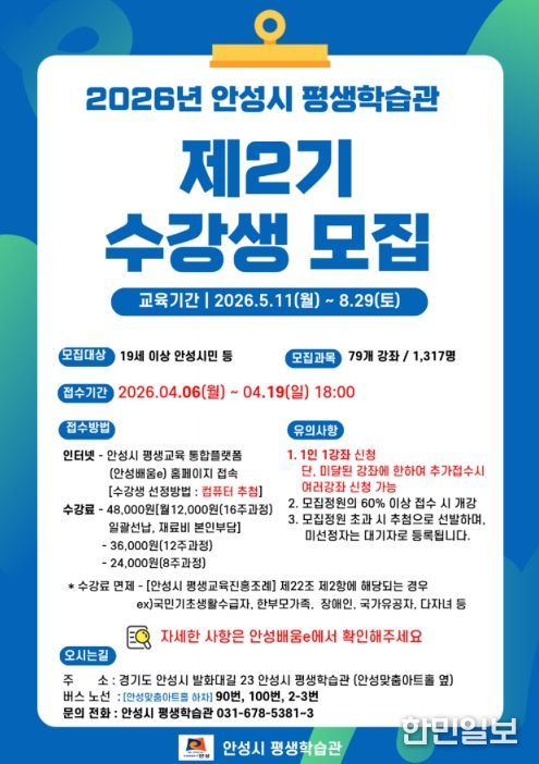한민일보 서울포커스 임경복 기자 | 안성시는 시민의 배움 기회를 확대하고 평생학습 참여를 활성화하기 위해 '2026년 평생학습관 제2기 프로그램' 수강생을 모집한다.