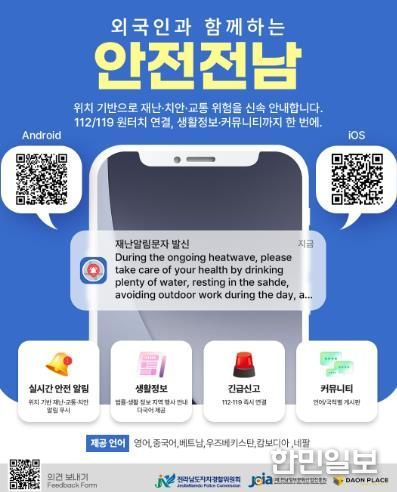 한편, ‘다국어 안전전남 앱’은 스마트폰 앱스토어에서 무료로 내려받을 수 있다.