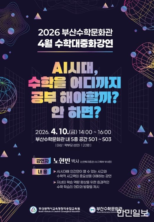 한민일보 서울포커스 임광현 기자 | 부산광역시교육청창의융합교육원 분원 부산수학문화관은 오는 10일 오후 2시 부산수학문화관에서 학부모 및 시민 120여 명을 대상으로 ‘4월 수학대중화 강연’을 개최한다.