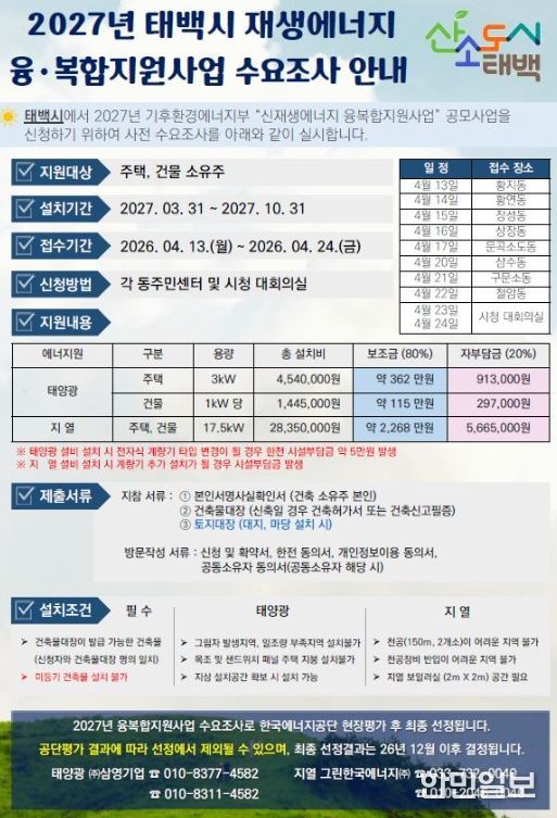 한민일보 서울포커스 임경복 기자 | 태백시는 재생에너지(태양광, 지열) 설치를 지원하는 공모사업인 ‘2027년 태백시 재생에너지 융복합지원 사업’ 추진을 위해 오는 5월 13일까지 수요조사를 실시한다고 밝혔다.