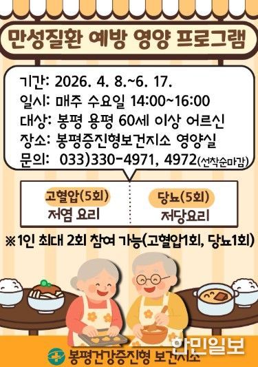 한민일보 서울포커스 진광성 기자 | 평창군보건의료원은 4월 8일부터 6월 17일까지 매주 수요일 오후 2시부터 4시까지 봉평건강증진형 보건지소 영양교육실에서 봉평 권역(용평·봉평) 지역 주민을 대상으로 '만성질환 예방 영양 프로그램'을 운영한다.