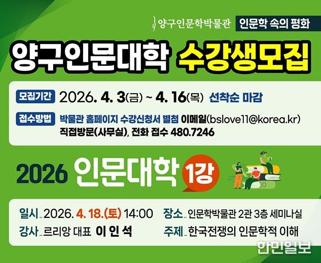 한민일보 서울포커스 진광성 기자 | 양구군이 4월 16일까지 양구인문학박물관에서 운영하는 ‘2026 양구인문대학 수강생’을 모집한다.