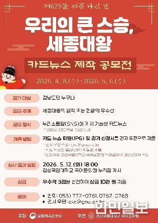 한민일보 서울포커스 박근원 기자 | 경상국립대학교 국어문화원은 제629돌 세종 나신 날(5월 15일)을 기념하여 ‘우리의 큰 스승, 세종대왕 카드뉴스 제작 공모전’을 개최한다.