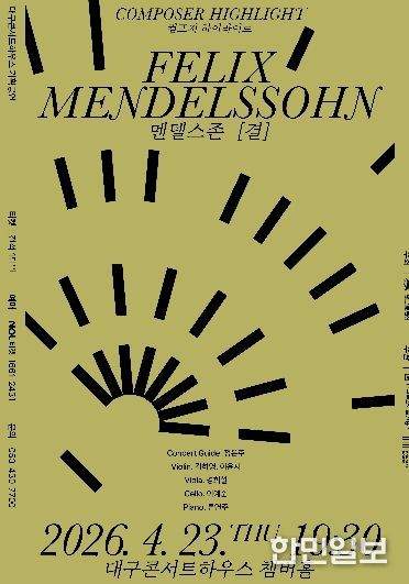 한민일보 서울포커스 김봉순 기자 | 대구문화예술진흥원 대구콘서트하우스는 4월 23일 오후 7시 30분, 챔버홀에서 ‘컴포저 하이라이트 : 멘델스존, 결’을 개최한다.