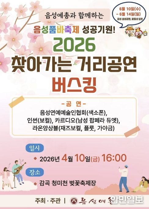 군 관계자는 “만개한 청미천의 벚꽃 아래서 가족, 연인, 친구와 함께 음악을 감상하며 잊지 못할 봄날의 추억을 만드시길 바란다”며 “앞으로도 지역 예술인들이 재능을 펼칠 수 있는 무대를 지속적으로 마련하고, 군민들이 일상 속에서 언제든 문화를 즐길 수 있는 ‘문화도시 음성’을 만들어가겠다”고 말했다.