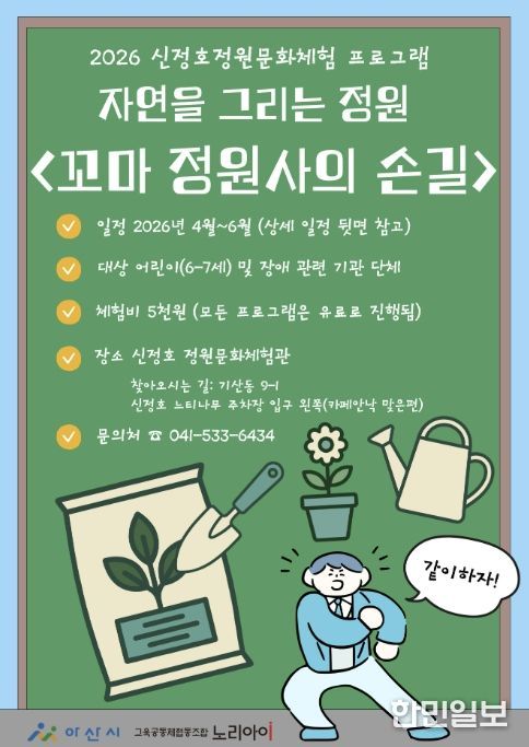 한민일보 서울포커스 임경복 기자 | 아산시는 오는 4월 13일부터 6월 23일까지 신정호정원에서 상반기 정원문화체험 프로그램을 운영한다고 밝혔다.