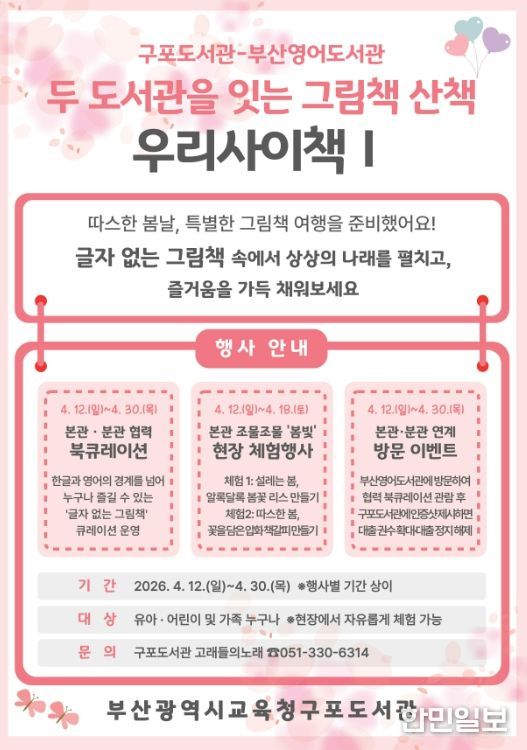 한민일보 서울포커스 임광현 기자 | 부산광역시립구포도서관은 오는 12일부터 30일까지 도서관의 날 및 도서관주간을 맞아 구포도서관과 부산영어도서관에서 유아·어린이, 도서관 이용자를 대상으로 독서문화 협력 사업 ‘우리사이책Ⅰ’을 운영한다.
