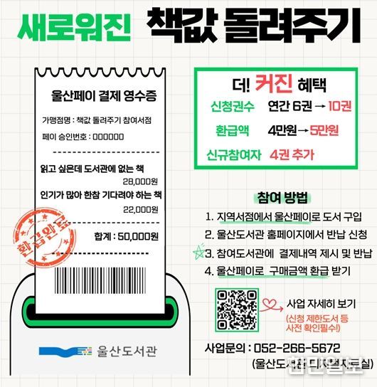 한편, 올해 사업은 지난 1월 20일부터 시작해 예산 소진 시까지 운영된다. 자세한 참여 방법은 울산도서관 누리집 ‘책값 돌려주기’를 참고하면 된다.