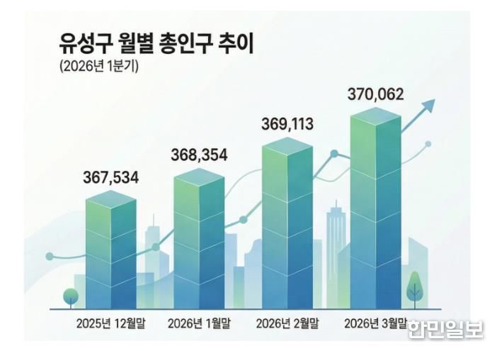 유성구가 2025년 12월 말부터 2026년 3월 말까지 주민등록 인구를 분석한 결과, 1분기 유성구 인구는 36만 7,534명에서 37만 62명으로 2,528명이 늘었다.